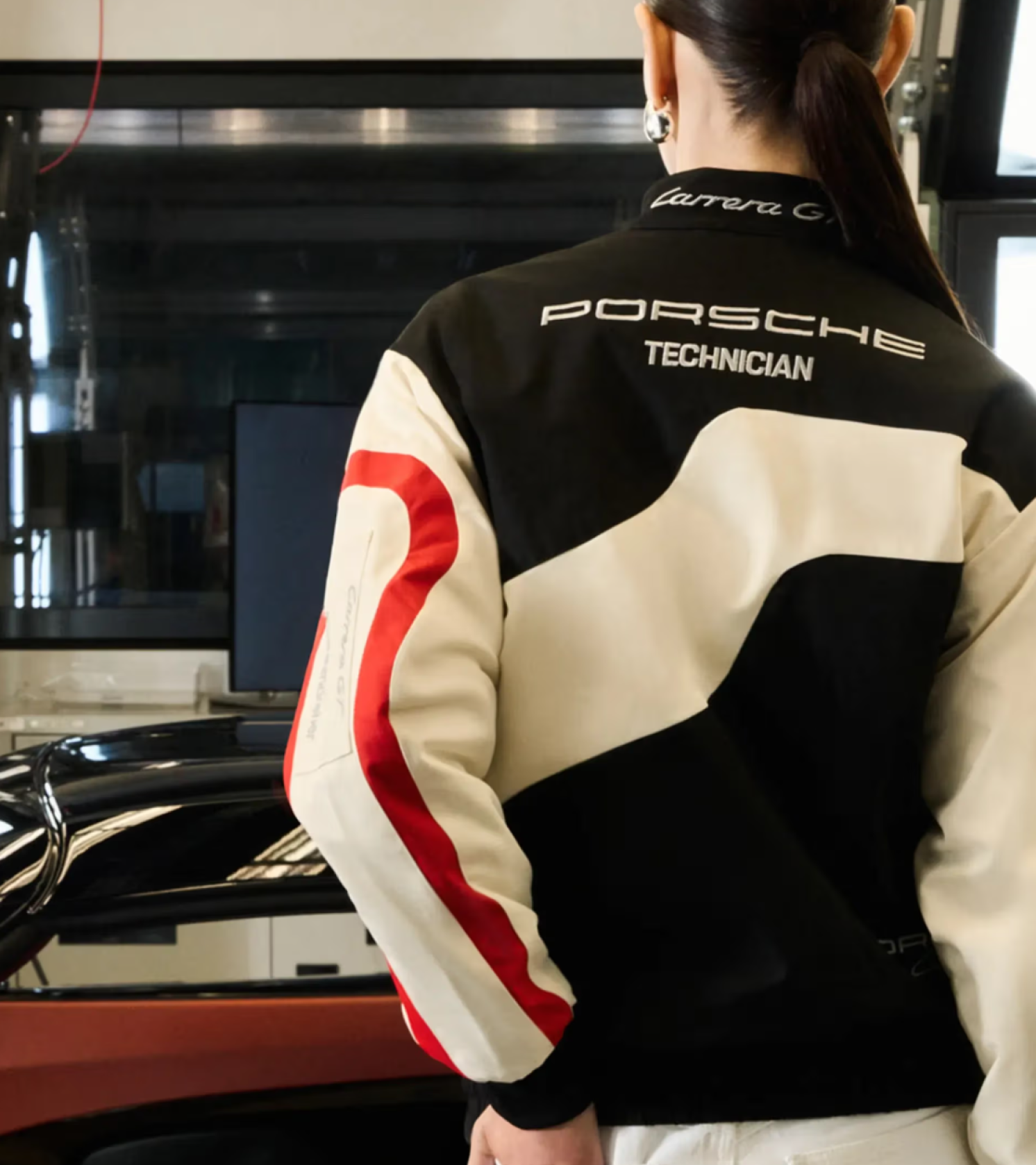 Unisex tipo bomber stiliaus striukė su kontrastingomis detalėmis, užtrauktuku su Porsche herbu ir siuvinėtais logotipais.
