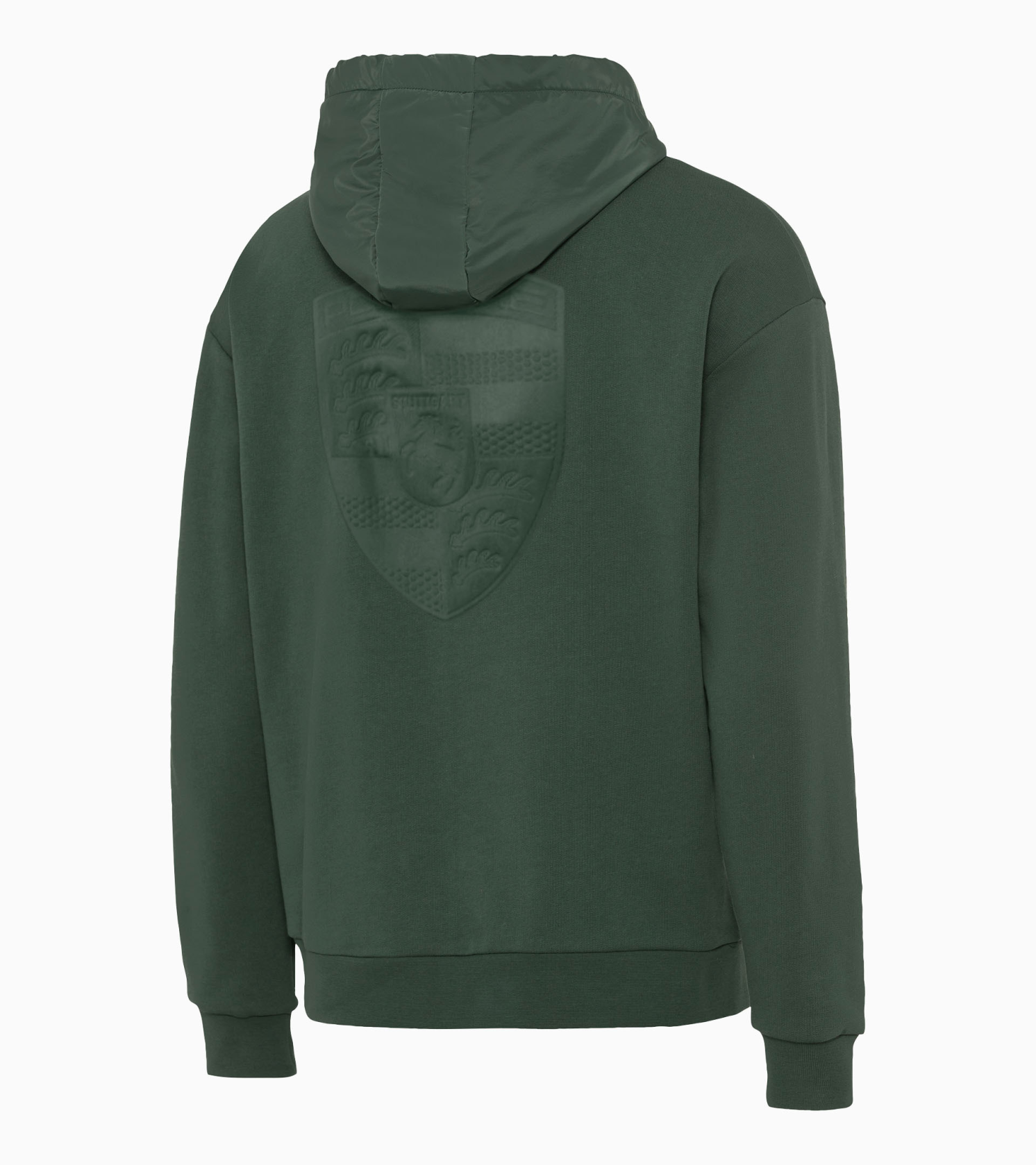 Minimalizmas susitinka su elegancija: unikalaus dizaino Essential kolekcija, kuri atspindi Porsche dvasią pačia rafinuočiausia forma. Džemperis pasiūtas naudojant du audinius, medvilnę ir nailoną, Priekyje yra „kengūros“ kišenė. Džemperis iš nugaros dekoruotas reljefiniu Porsche herbo antspaudu, o priekyje, kairėje krūtinės pusėje, yra nedidelis logo.
