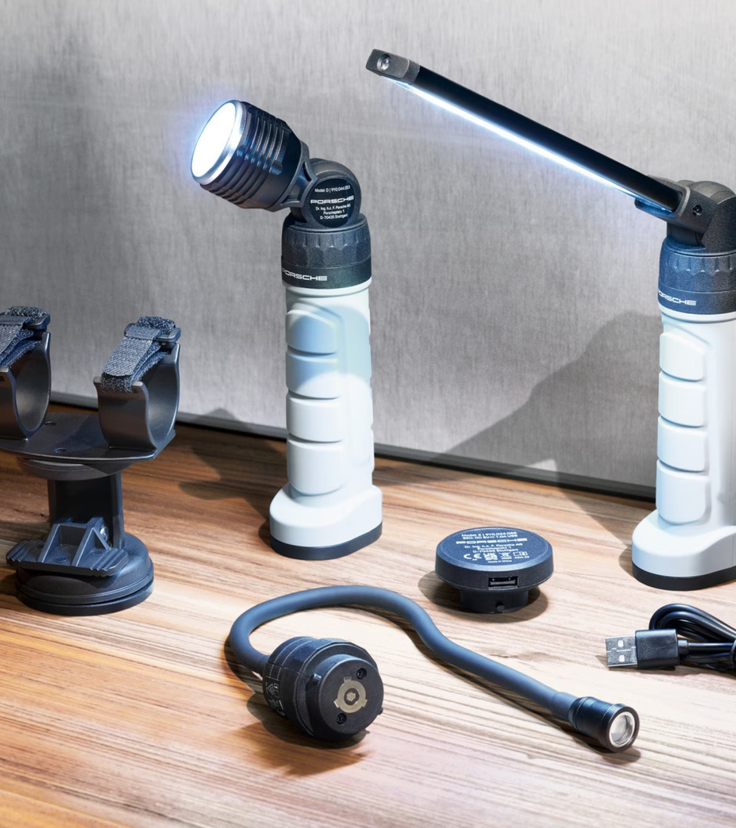Pilkos spalvos su baltu „PORSCHE“ logotipu