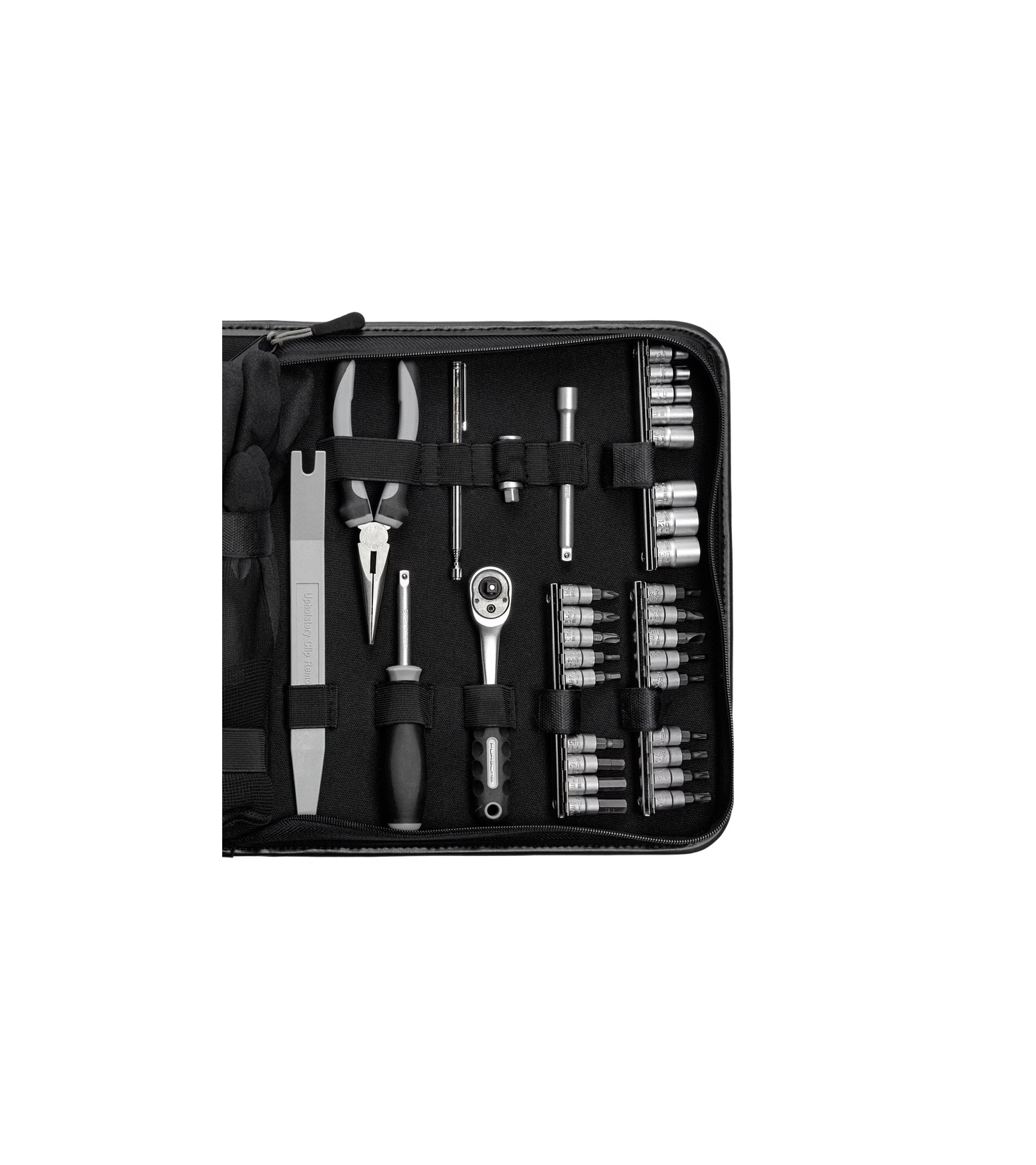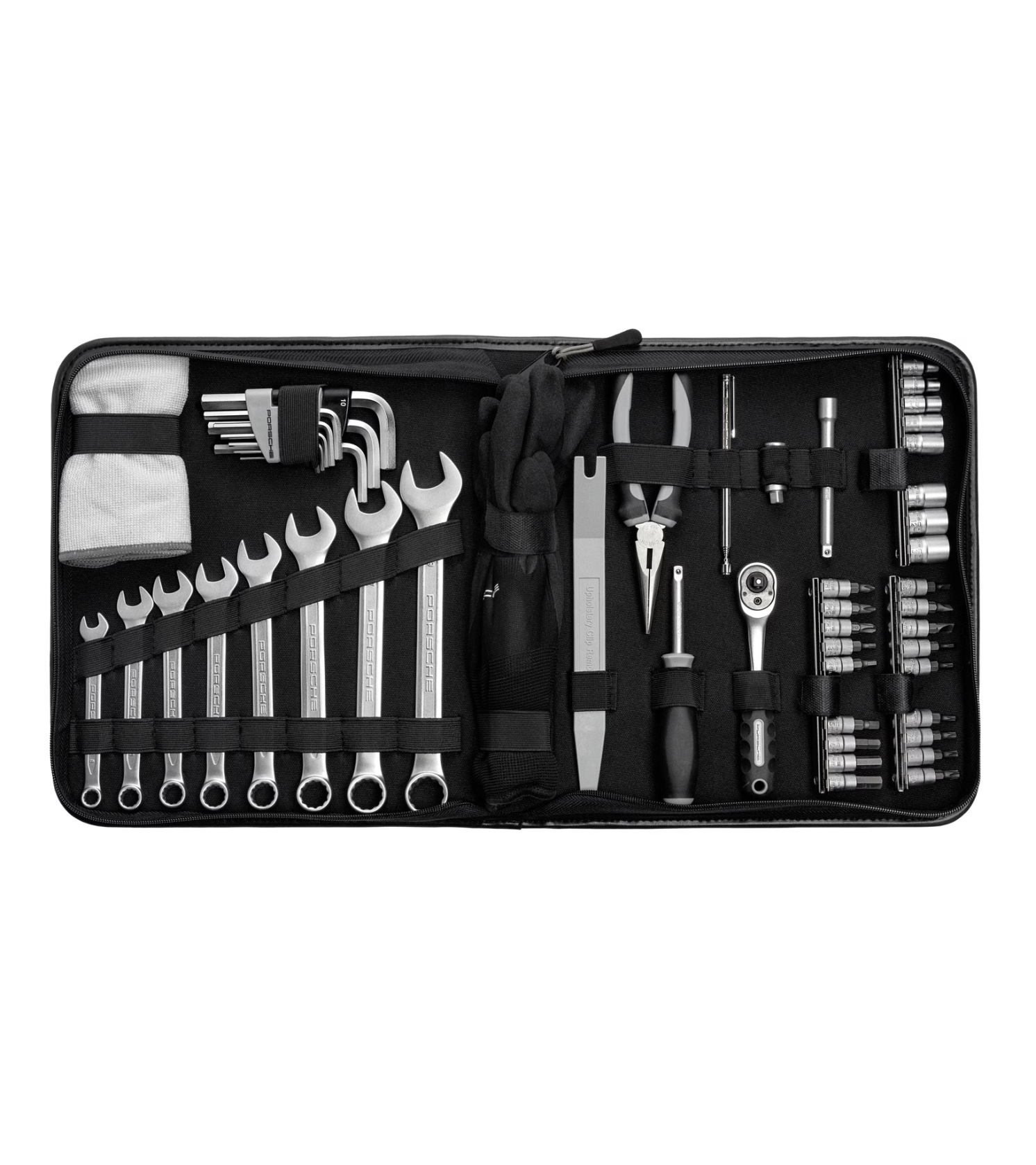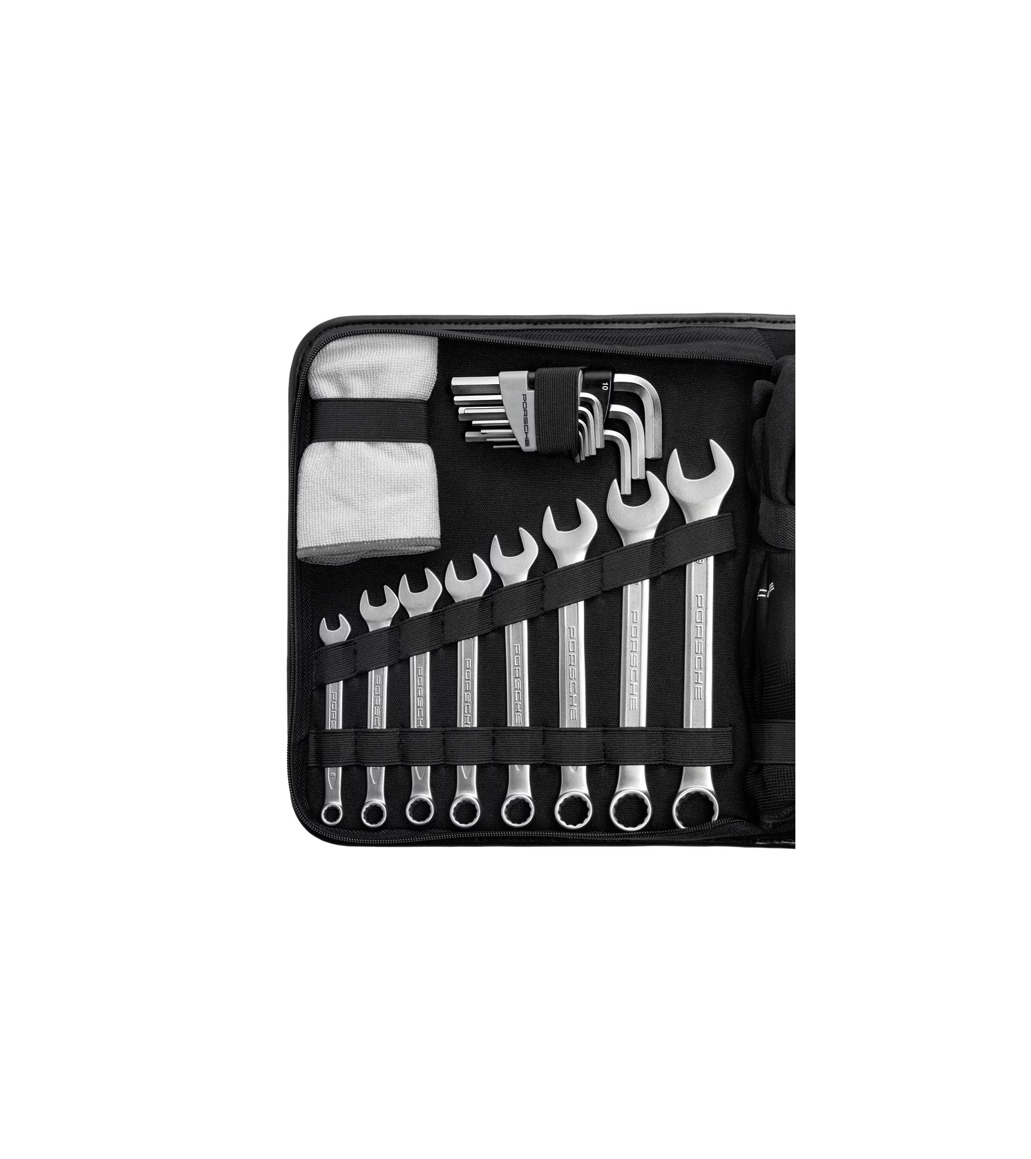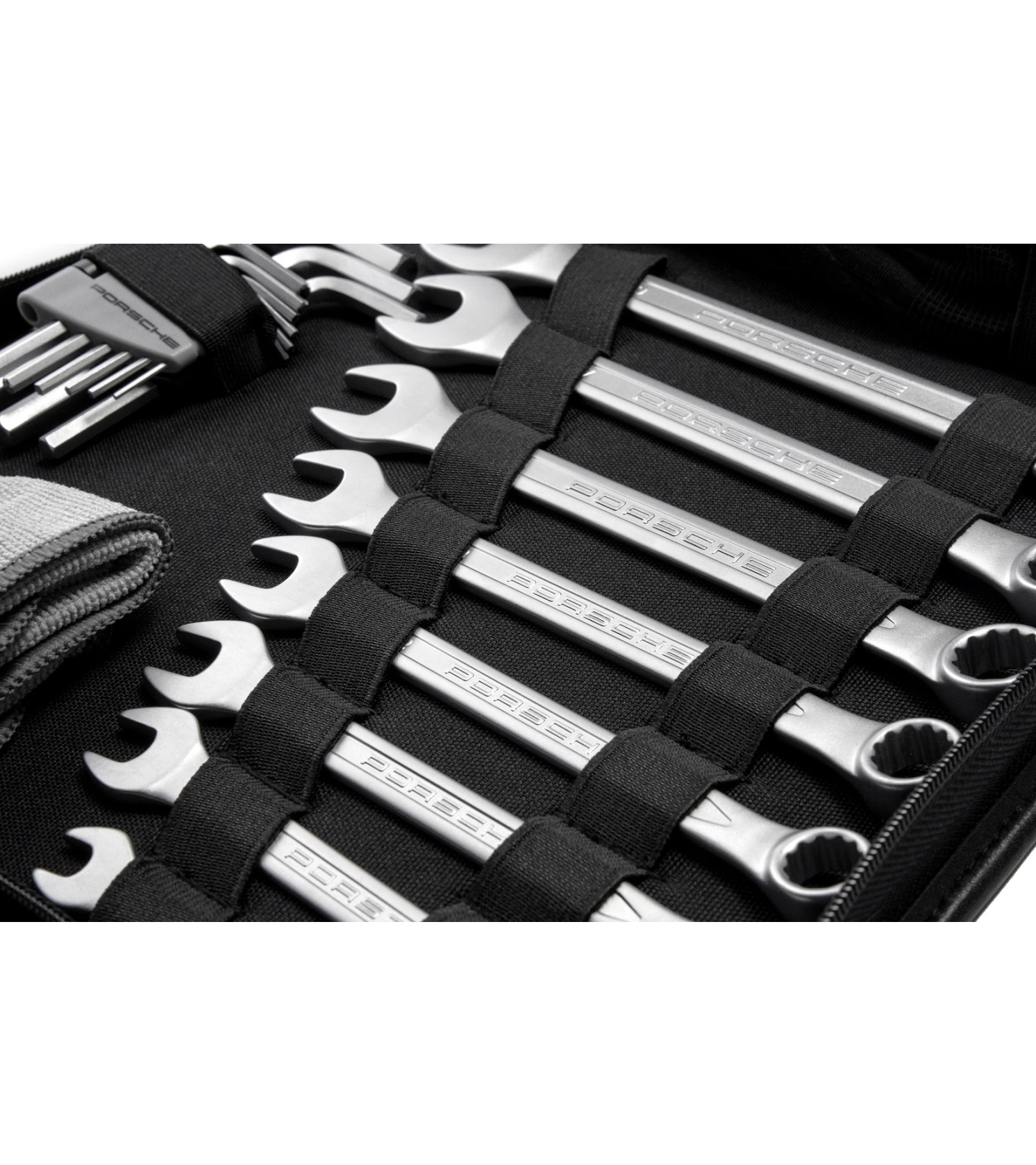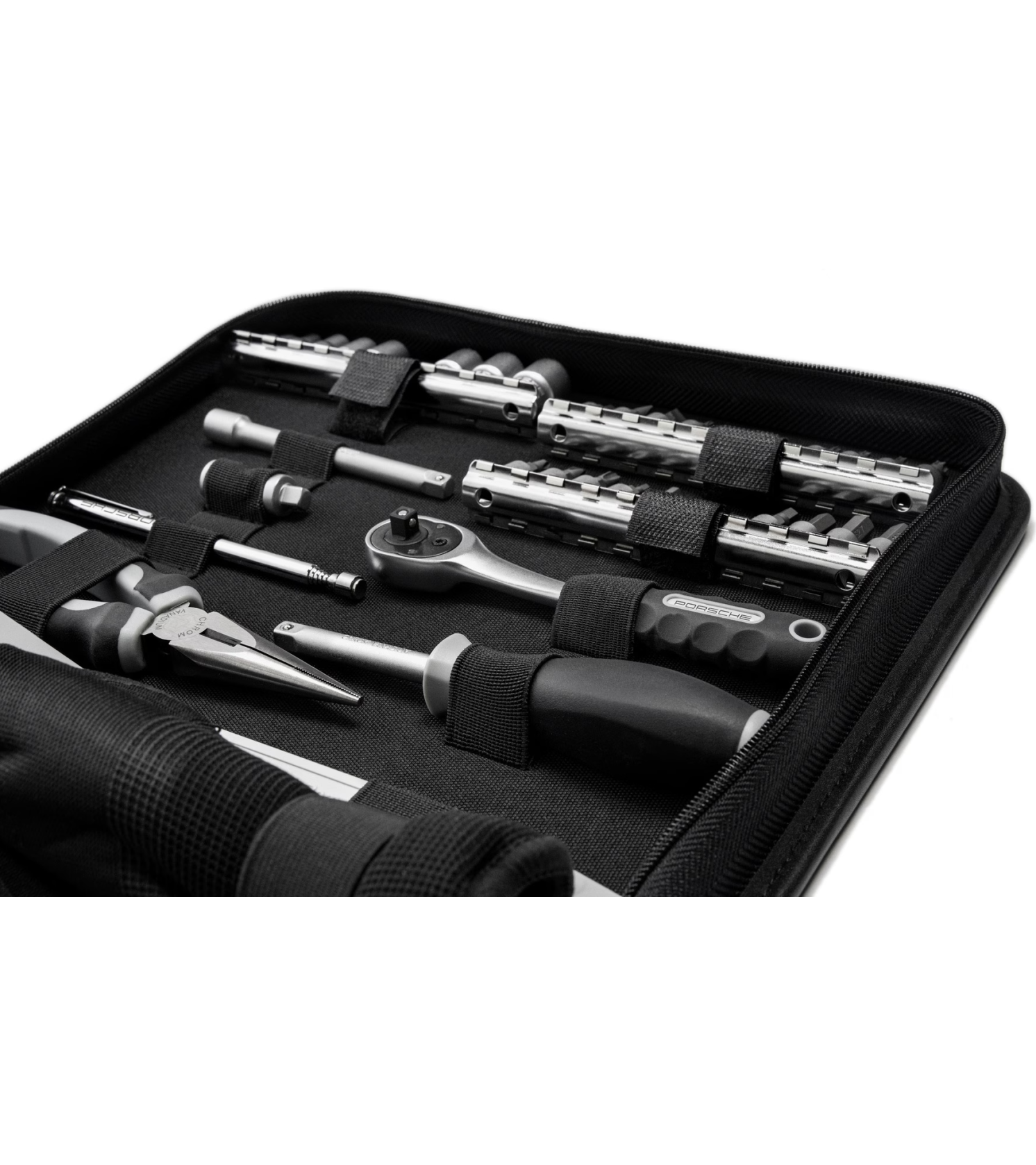 Sportiškas įrankių komplektas: elegantiškas odinis dėklas su įspaustu „Porsche“ herbu. Kruopščiai apgalvotas įrankių rinkinys su „Porsche“ logotipais ant įrankių – tai kompaktiškas ir prabangus sprendimas įvairiems darbams tiek garaže, tiek namuose. Nuo teleskopinio magneto, kuris leidžia pasiekti net sunkiai prieinamas vietas, iki apsauginių pirštinių – viskas patogiai pasiekiama ir paruošta naudoti.